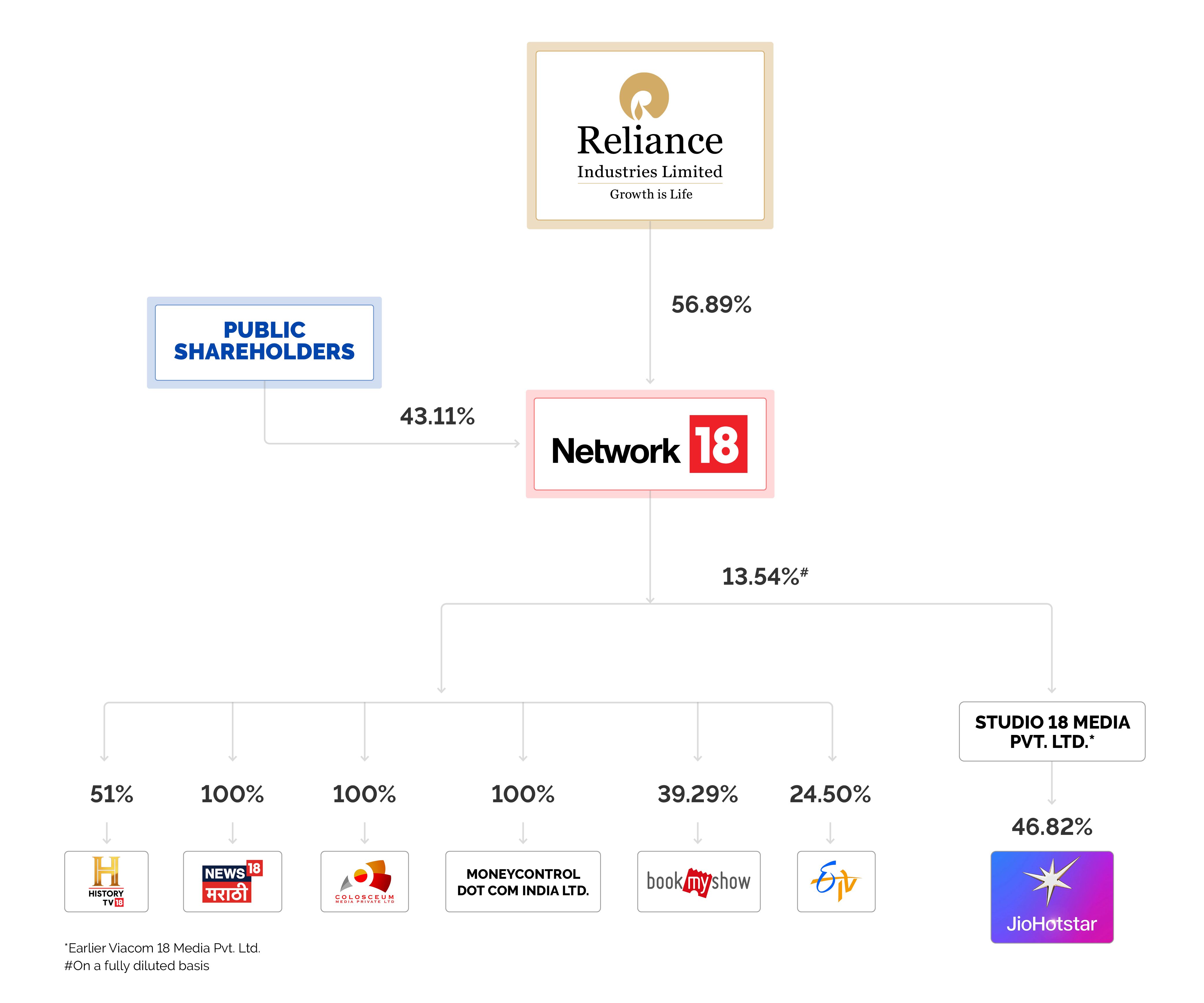 - Studio18 Media Pvt. Ltd. (13.54% stake on a fully diluted basis, formerly Viacom18), holds 46.82% stake in Jiostar, which is one of India's leading media companies with 100+ entertainment and sports channels and one of the largest OTT platforms, JioHotstar.